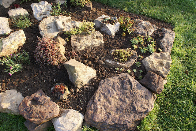 Une fois l'étape de la terre et des pierres placées, y a plus qu'à planter mes pauvres plantes délaissées depuis plus de 6 mois ici et là : certaines ont souffert mais l'année prochaine, j'ai confiance, elles seront superbes :-)